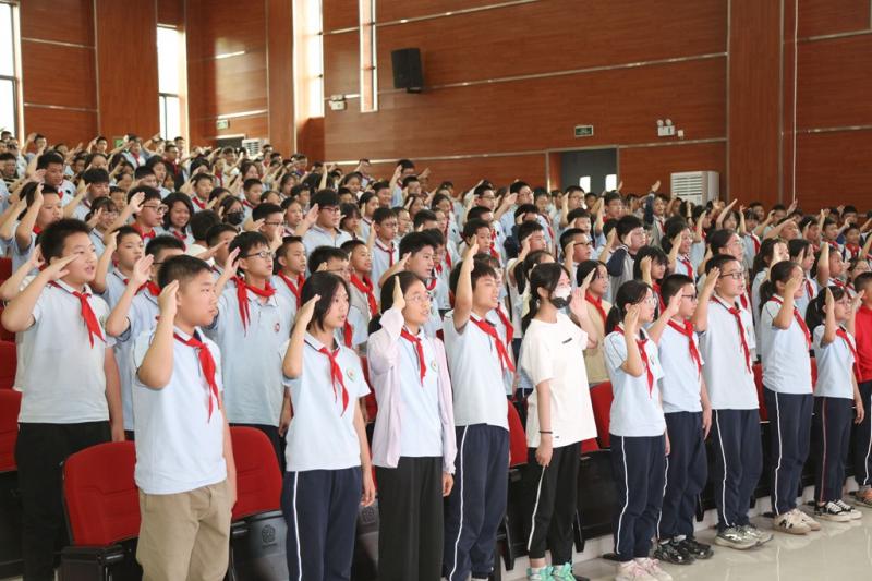 在鲜红队旗的见证下,全体少先队员齐唱中国少年先锋队队歌,响亮的队歌振奋人心,鲜红的队旗迎风飘扬。