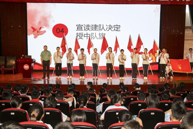 由孙建军副校长宣布在初一年级建立9支中队的决议,宣读各中队辅导员名单,并授予各中队队旗。
