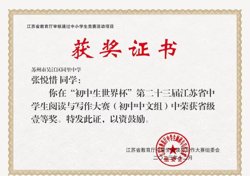 我校张悦惜同学在第二十三届江苏省中学生阅读与写作大赛中获得佳绩