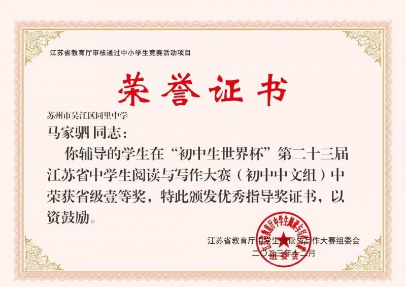 在刚刚结束的”初中生世界杯”第二十三届江苏省中学生阅读与写作大赛中,我校初三(8)班张悦惜同学代表苏州市吴江区参加了角逐,在全省一千三百多名选手中突颖而出,取得了省一等奖的好成绩。在此,我们对她及指导老师马家驷表示热烈地祝贺。学校也专门为此举行了隆重的表彰大会。