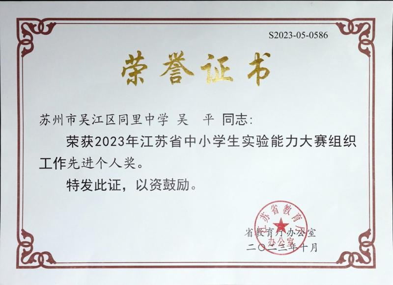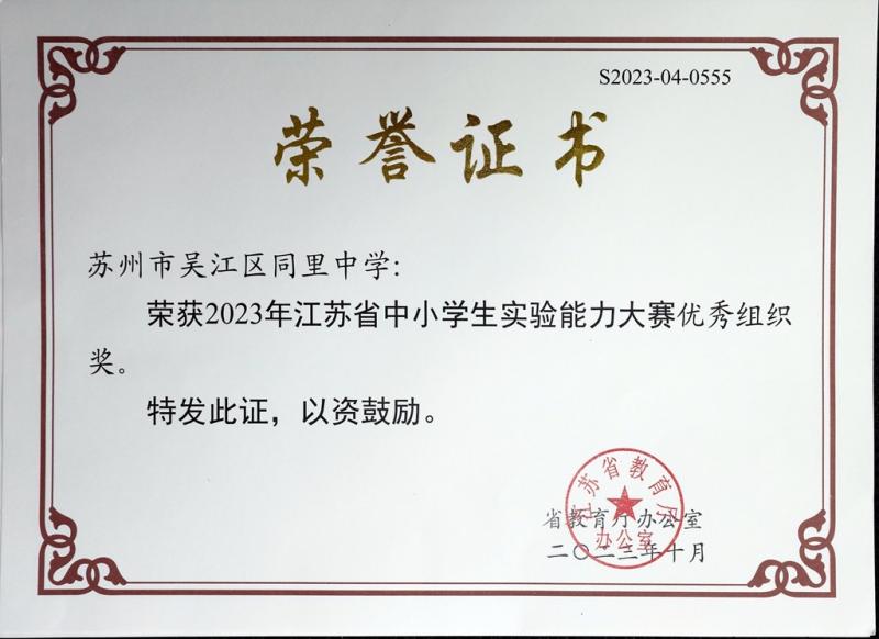 根据《省教育厅办公室关于举办2023年江苏省中小学生实验能力大赛的通知》(苏教办备函〔2023〕2号)精神,省教育厅委托省教育装备与勤工俭学管理中心组织举办了2023年江苏省中小学生实验能力大赛。我校生物组吴平、蒋丽琴、王马平、刘洁等四位老师精心组织,广泛发动全校师生积极参与,最终在生物实验比赛中获得省先进个人与优秀组织奖。举办中小学生实验能力大赛是凸显育人导向,适应国家发展战略要求,加强基础学科拔尖创新后备人才发现和培养的重要途径。我校获奖师生会再接再厉,积极发挥示范表率作用,加强和改进中小学实验教学工作,鼓励和引导广大中小学生积极参加实验活动,切实提高中小学实验教学质量,着力提升育人水平。