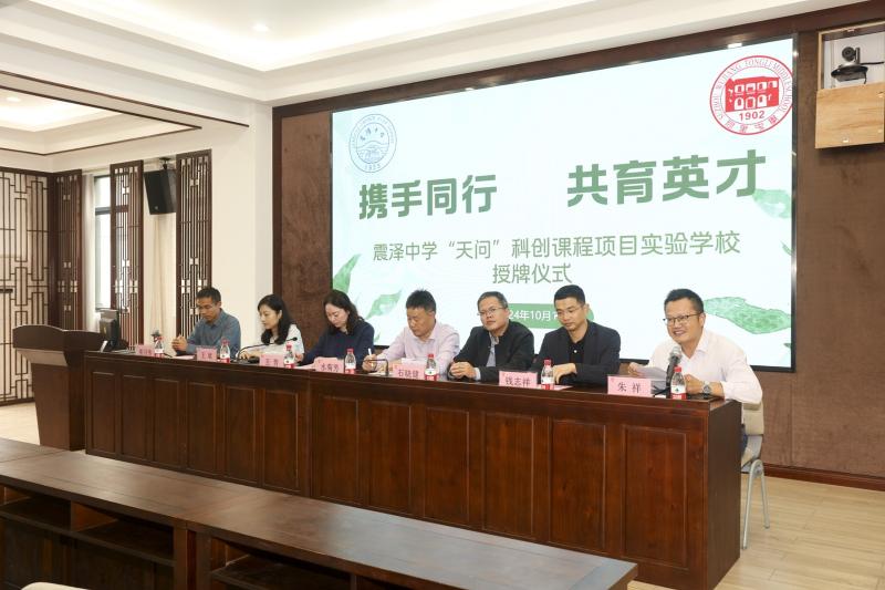 震泽中学初中部校长钱志祥介绍“天问”科创课程项目实验学校的相关情况,包含指导思想、目标任务、队伍建设、实施保障等方面,希望两校通力合作,共同探索拔尖创新人才初高中一体化培养新模式。